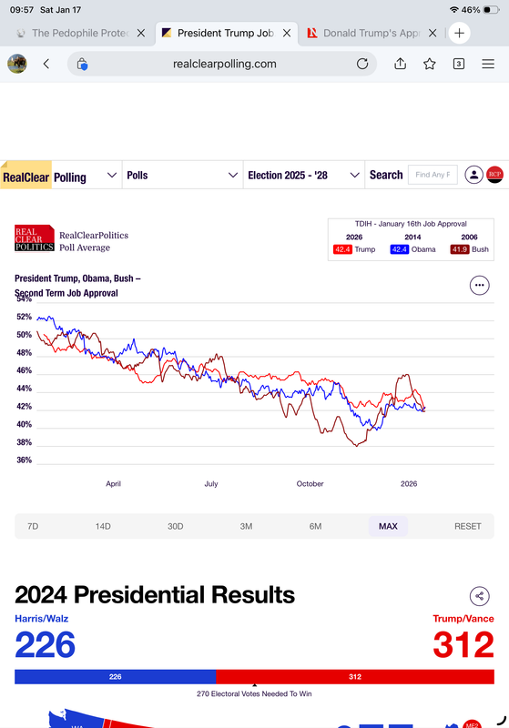 Similarly, an AP-NORC poll of 1,203 adults conducted January 8-11, 2026, found that just 40 percent of U.S. adults approve of Trump’s handling of his job, with 59 percent disapproving, netting -19 points.